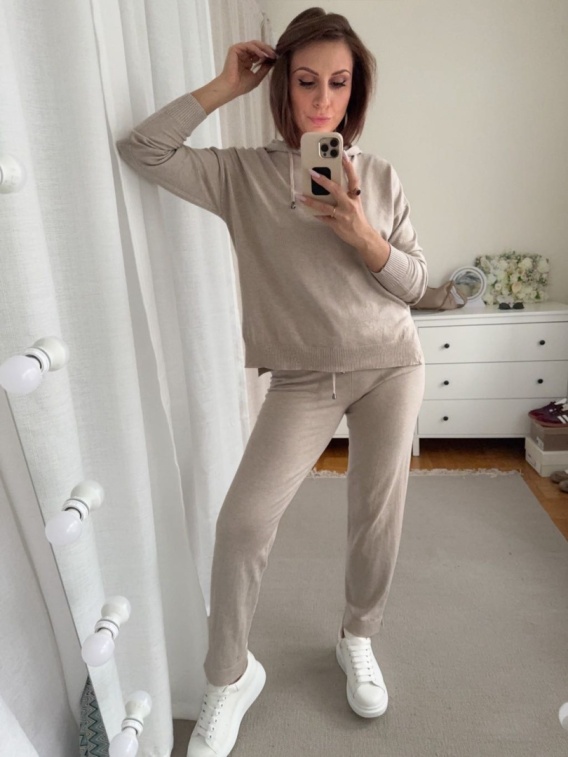 Miękki, dzianinowy dres damski z kapturem, składający się z bluzy i spodni. Dostępny w kilku kolorach: szarości, beżu, czerni i jasnego ecru. Bluza ma luźny, wygodny krój z regulowanym kapturem, a spodnie proste nogawki z elastycznym pasem. Całość jest lekka, przyjemna w dotyku i oddychająca, idealna do codziennego noszenia, pracy z domu czy podróży.
