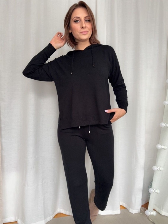 Miękki, dzianinowy dres damski z kapturem, składający się z bluzy i spodni. Dostępny w kilku kolorach: szarości, beżu, czerni i jasnego ecru. Bluza ma luźny, wygodny krój z regulowanym kapturem, a spodnie proste nogawki z elastycznym pasem. Całość jest lekka, przyjemna w dotyku i oddychająca, idealna do codziennego noszenia, pracy z domu czy podróży.